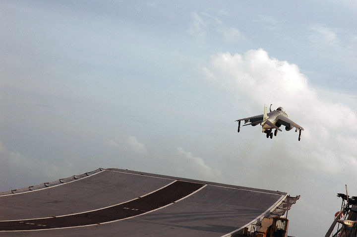 영국의 인비지블급에서 이륙하는 해리어 공격기. 해리어는 수직이착륙뿐만 아니라